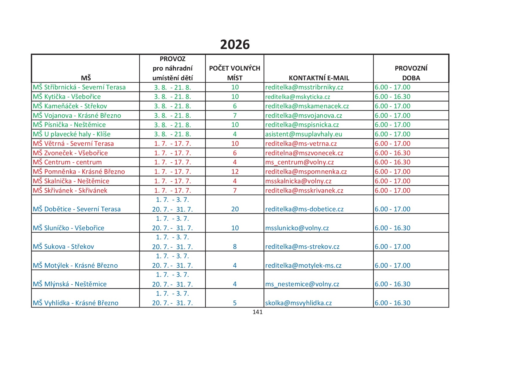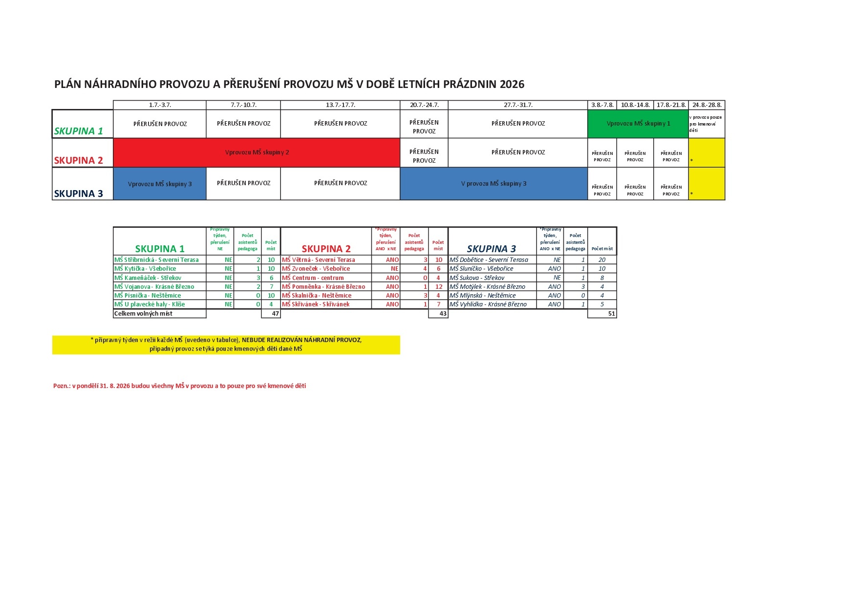 Provoz v MŠ Skřivánek bude v době letních prázdnin přerušen v následujícím termínu: